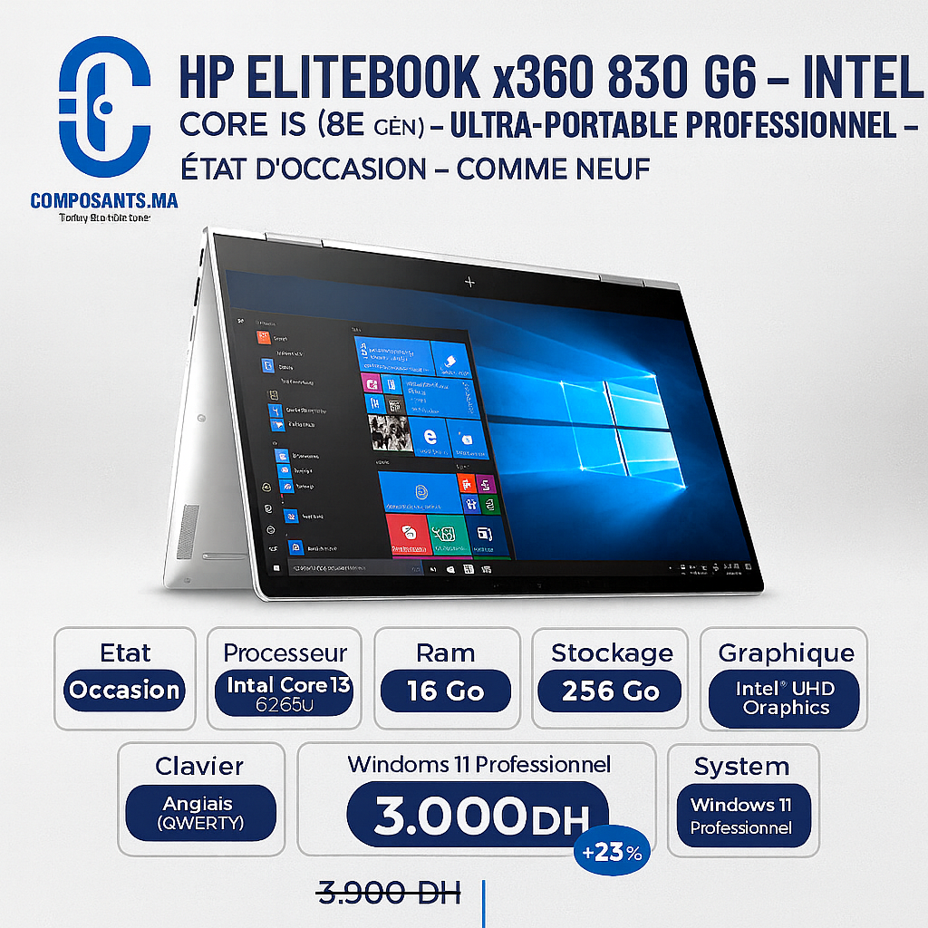 HP EliteBook x360 830 G6 – Intel Core i5 (8ᵉ Gén) – Ultra-Portable Professionnel – État D’occasion – comme neuf